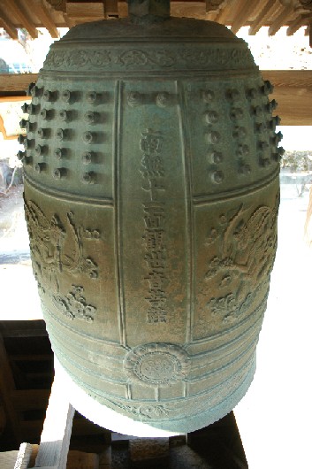 かつては毘沙門堂の東にありましたが、 1909年(明治42年)この地に移転しました。 4〜9月は朝6時、10〜3月は7時に、 篤志の有志たちの手で毎朝6つずつ撞かれています。 大晦日の夜には、 除夜の鐘を撞きに大勢が集まります。 春になると傍の桜が見事です。 現在の鐘は、1976年(昭和51年)に、 木津の斎藤豊二さんが奉納されたものです。 |